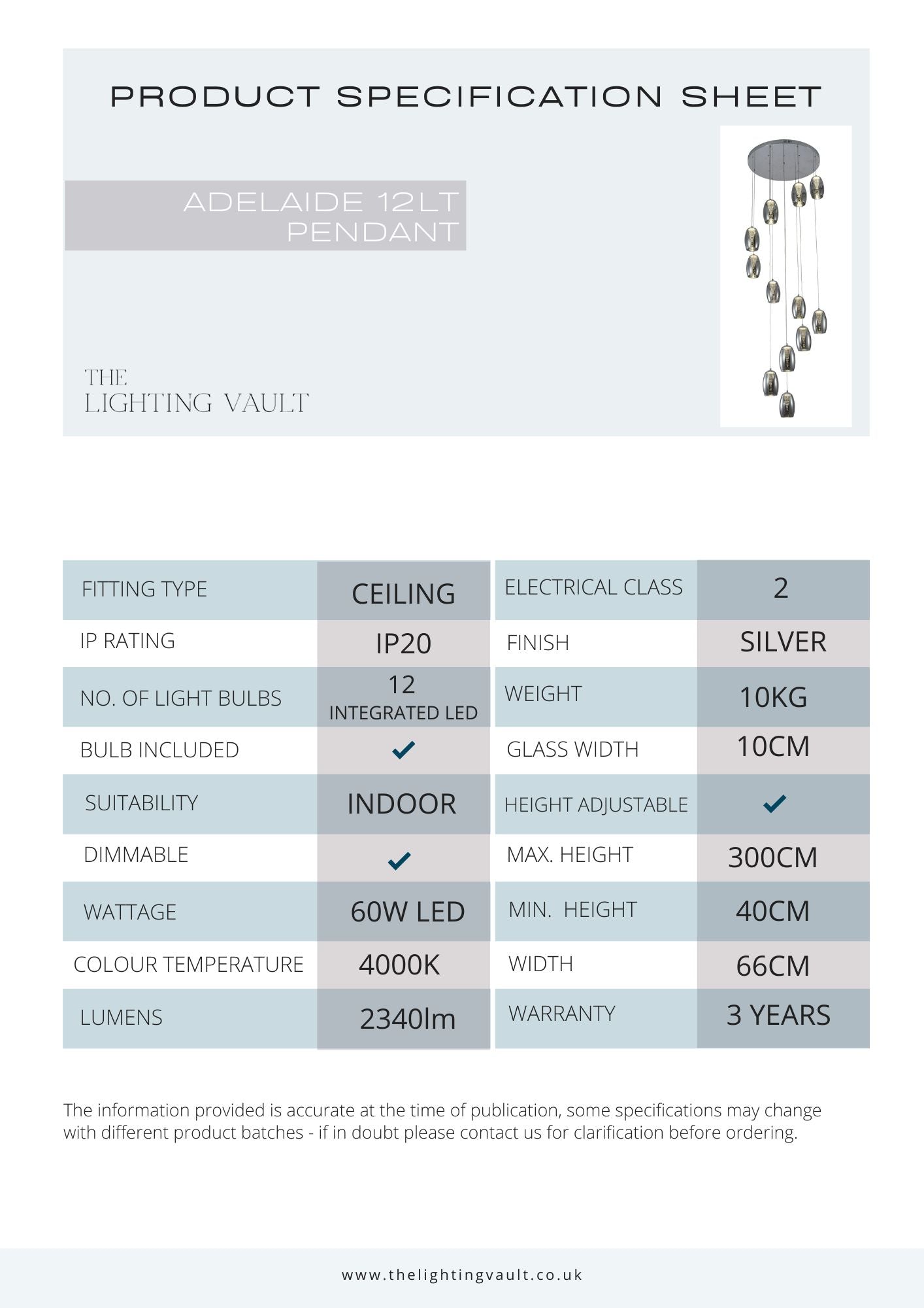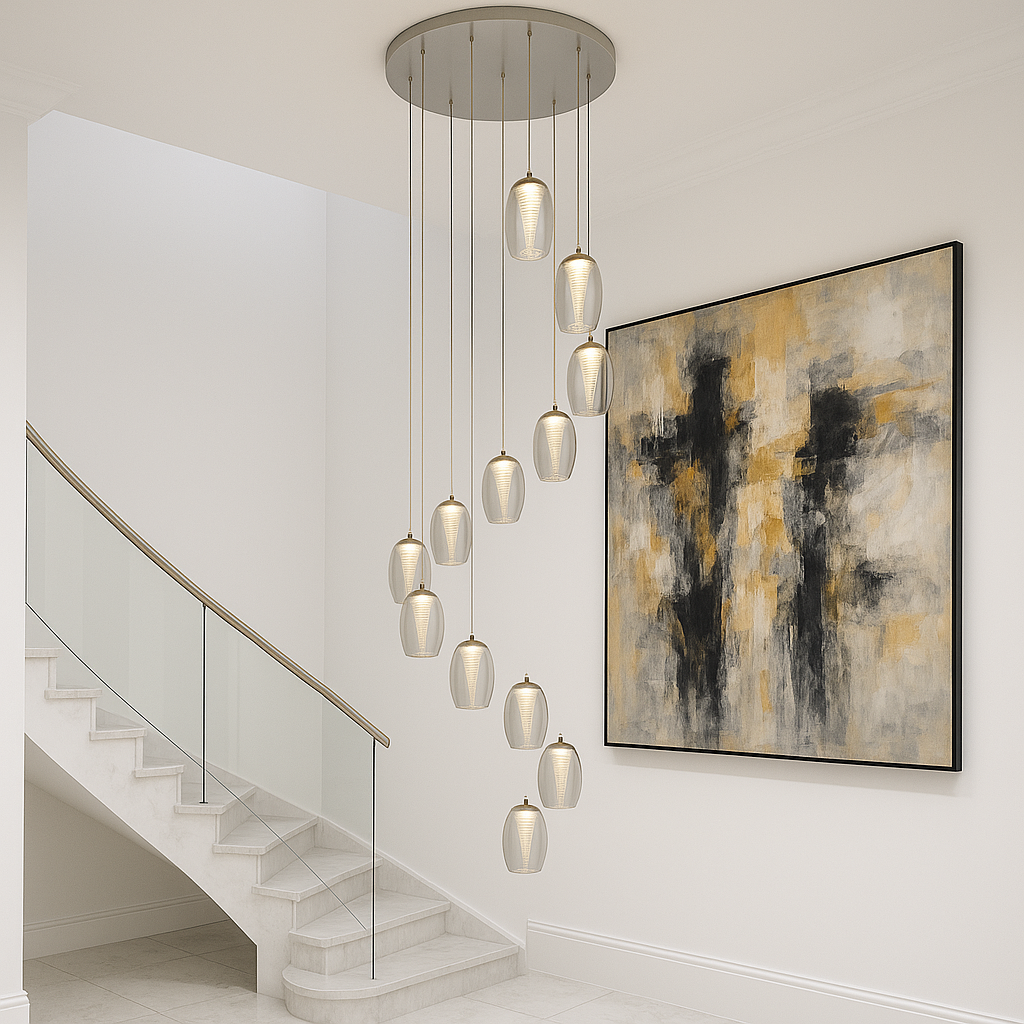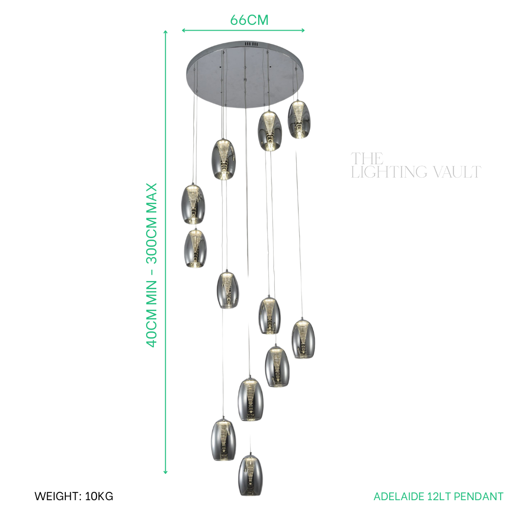Bring sculptural elegance into your home with the Nova Lighting Adelaide 12-Light Spiral Pendant, available in your choice of smoked or clear glass. Designed to make a statement in stairwells and double-height spaces, this striking pendant features twelve glass shades suspended from a polished chrome ceiling plate, arranged in a cascading spiral that creates movement and architectural drama. Each shade surrounds an illuminated inner structure, producing a warm yet crisp cool white glow that feels both contemporary and inviting. With an adjustable drop of up to 3 metres, the Adelaide pendant can be tailored perfectly to your space, while its dimmer compatibility allows you to set the mood with ease. Combining refined design with practicality, this modern centrepiece offers impressive light output, replaceable LED components for longevity, and comes backed by a 3-year warranty. A true fusion of form and function, the Adelaide 12-Light Spiral Pendant transforms any interior into a luxurious showcase.