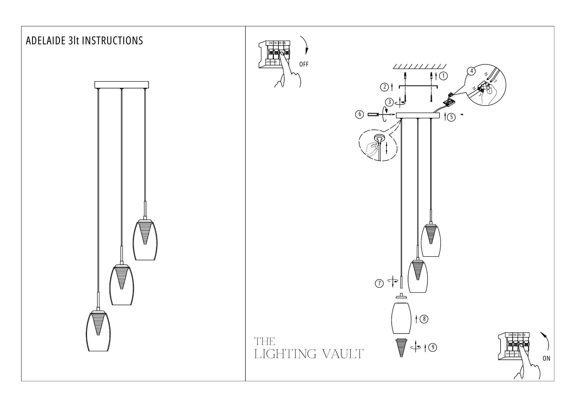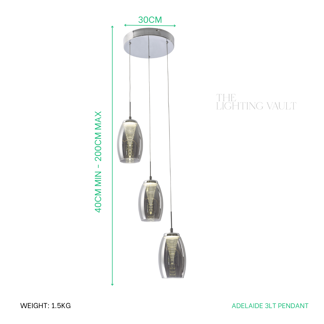 The Adelaide Spiral Pendant is a minimalist LED light with clear or smoked outer glass shade and an inner pyramid design. Finished with a high polished chrome plate, the height of this light is easily adjusted at the time of installation. The individual pendant heads can all be arranged in a spiral or an alternating pattern. This elegant and simple design would look perfect used as bedside pendant lights. A large range of matching fittings and sizes are available in the Adelaide collection.