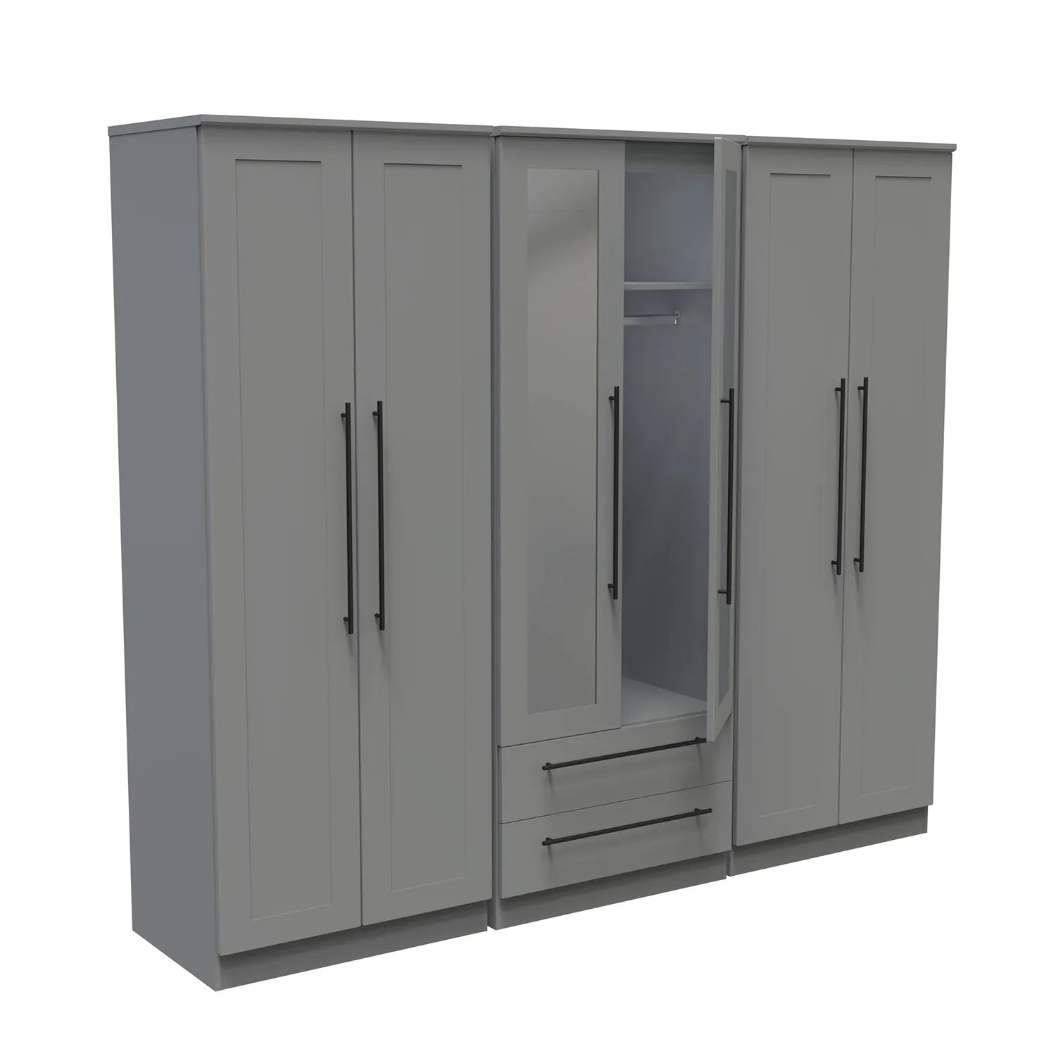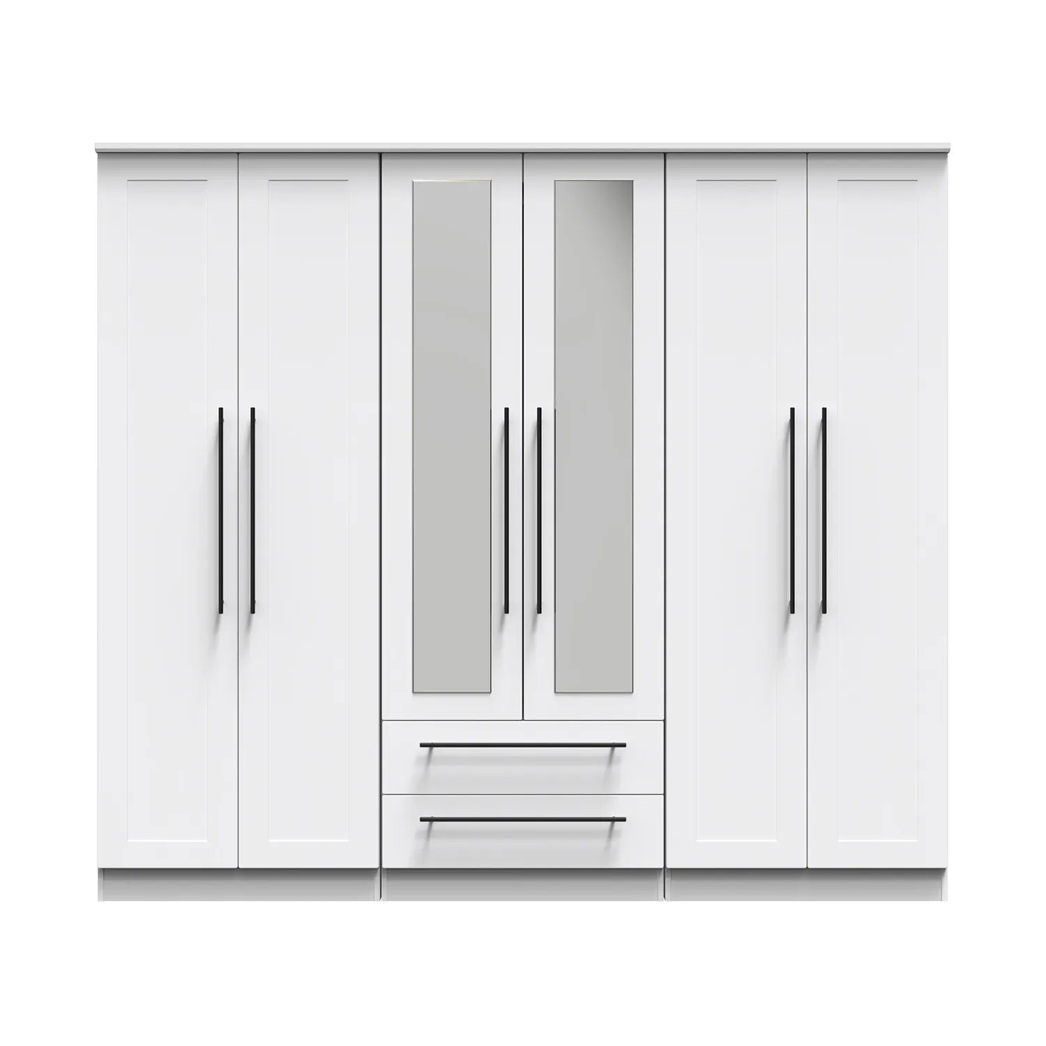Introducing the Beverley 6 Door Wardrobe, a spacious and stylish storage solution designed to elevate your bedroom decor. This wardrobe combines the functionality of two double wardrobes with straight doors and one double wardrobe with drawers, offering ample space to organise and store your clothing, accessories, and personal belongings.