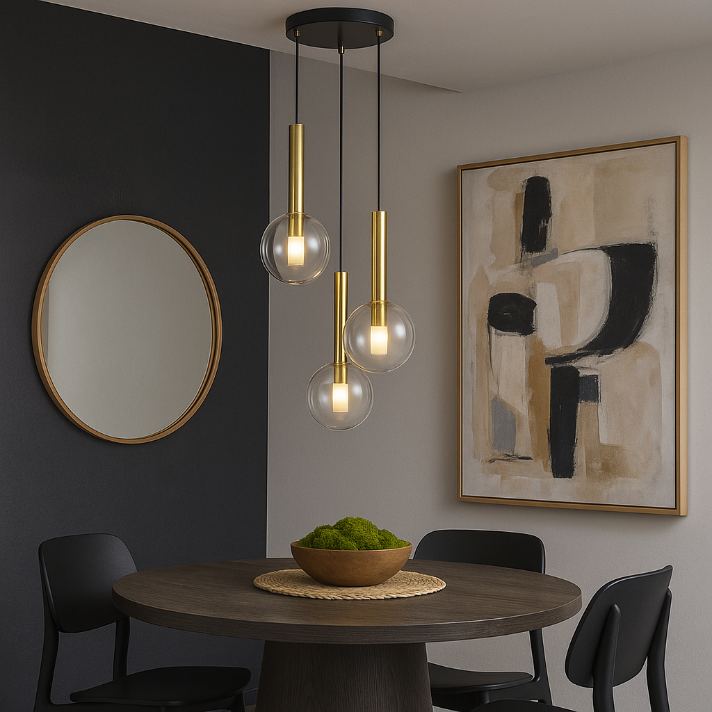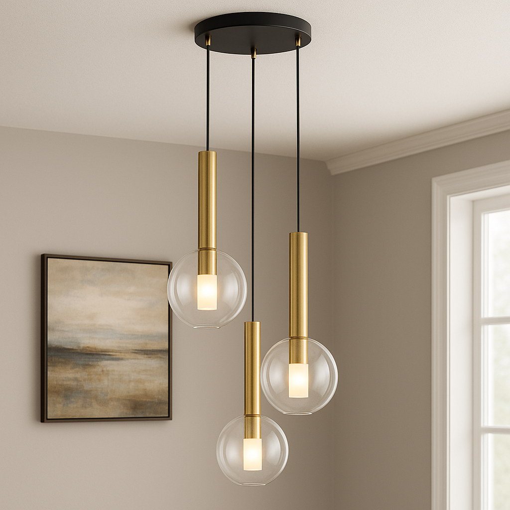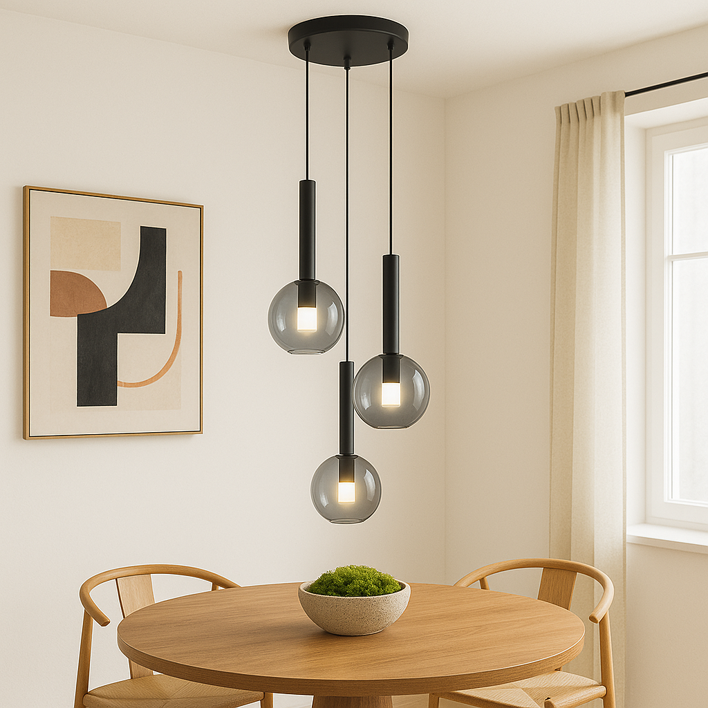 The Europa Lighting Brussels Spiral Pendant is a striking statement piece that blends contemporary elegance with timeless simplicity. Featuring three glass globes suspended in a spiral formation, this pendant adds movement, depth, and modern flair to any interior. Available in a choice of matte black or soft gold trim, it offers versatile styling to complement both bold monochrome schemes and warmer, more luxurious spaces. Measuring 35cm wide with an adjustable drop from 38.5cm to 143cm, it is perfectly proportioned for hanging above a dining table, bedside, or as a focal point in a living room. With three energy-efficient G9 LED bulbs and dimmable functionality, the Brussels Spiral Pendant combines style and practicality, delivering a soft, ambient glow that enhances both everyday living and entertaining.