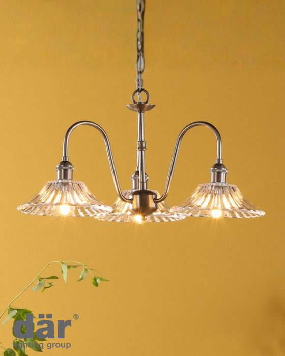The Hadano 3 Light Pendant Suspension combines heritage charm with modern versatility. Finished in antique chrome with vintage detailing, it features an Easy Fit clear flared glass shade for crisp elegance. A metre of chain and grey braided cable add refinement, while the slender three-arm frame provides graceful, ample illumination. Perfect for living rooms, dining areas, kitchens, bedrooms, halls, or stairwells, it delivers timeless style and adaptable functionality.