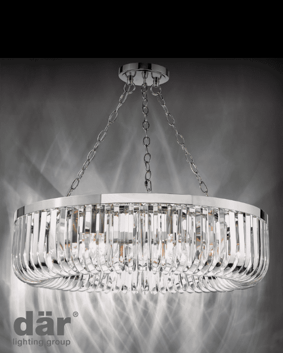 Add a touch of modern glamour to your space with the Sigourney 8-Light Pendant from Där Lighting. This stunning fixture features a polished nickel halo frame adorned with delicate loops of real crystal, forming a sophisticated donut-shaped silhouette that sparkles with elegance.