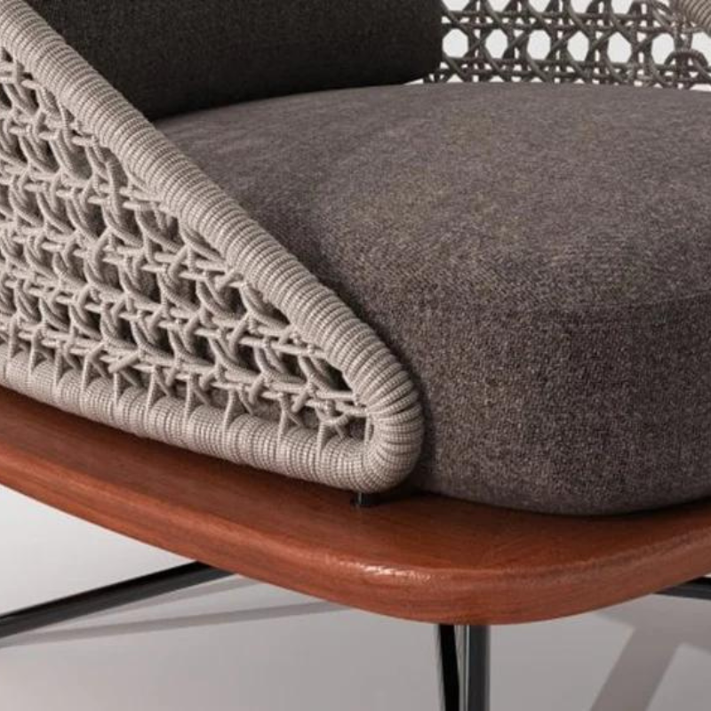 The chair’s base is made of solid iroko heartwood, which is highly appreciated for its durability and waterproof qualities. The chair’s backrest is made of woven polypropylene fiber, which is available in Light Grey and Dark Brown colors. The “cannage” effect weave of the backrest requires great skill and manual ability, making it a highly valued and unique piece of furniture.