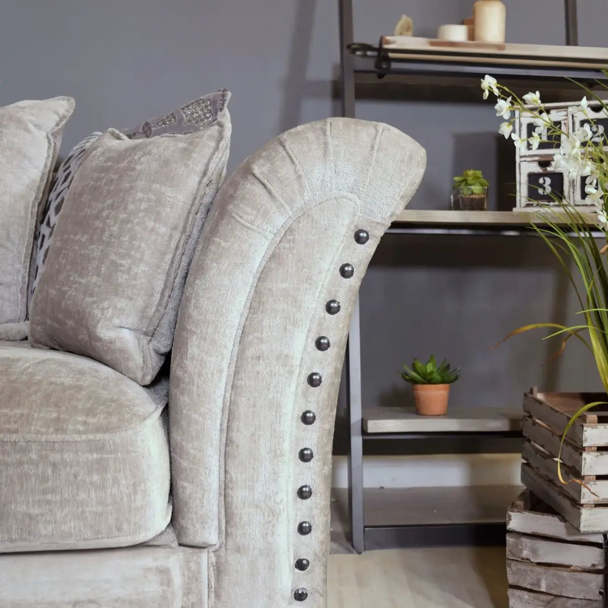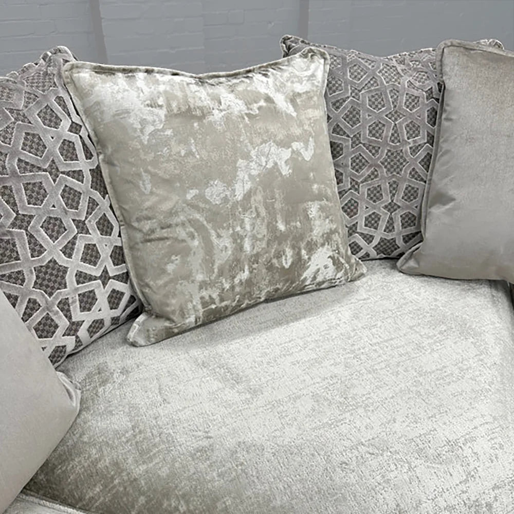 Transform your living room into a stylish and inviting sanctuary with the Holly Sofa main body and pillow back cushions, Sofa in the image is upholstered in luxurious Aaron Silver fabric, while the scatter cushions feature complimentary fabrics; Destiny Silver, Tessere Pebble, and Duchess Pebble. With its sophisticated design, plush cushions, and exquisite detailing, the Holly Sofa is the ultimate choice for those who seek both aesthetics and functionality.