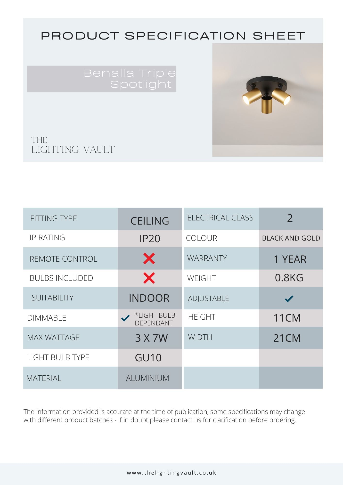 Bring modern elegance and practical lighting into your home with the Benalla Flush Ceiling Light. Designed in a striking black and brushed gold finish, this stylish 3-way spotlight combines sleek aesthetics with everyday functionality.