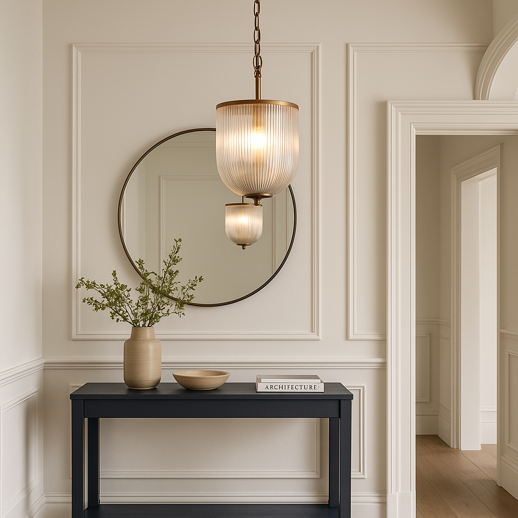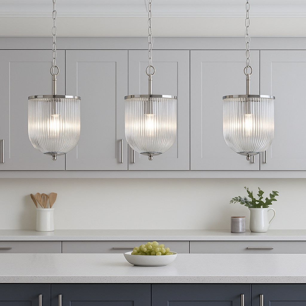 The Buxton Glass Lantern brings timeless elegance to any interior with its classic lantern silhouette and ribbed glass panels that cast a warm, diffused glow. Available in two refined finishes—polished silver for a clean, modern edge or rich bronze for a touch of vintage charm—this versatile piece suits kitchens, hallways, and entryways alike. Measuring 25.5cm wide with a 26cm lantern height, it offers an adjustable drop from 45cm to 127cm, making it ideal for both standard ceilings and taller Georgian-style spaces. Whether hung alone as a statement piece or in multiples for a dramatic effect.