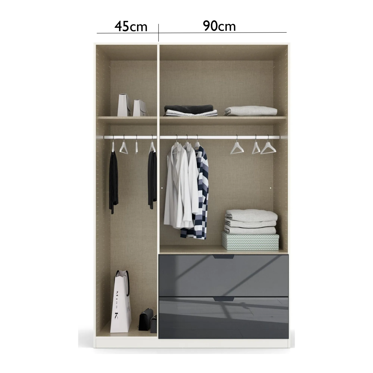 This configuration features three hinged doors and two large drawers at the base. On the left, a full-height single door conceals a 45cm-wide internal compartment, complete with a height-adjustable shelf and hanging rail. The two doors on the right sit above the integrated drawers and open to reveal a 90cm-wide compartment, also fitted with a shelf and rail, making it ideal for shared storage or separating clothing by type.