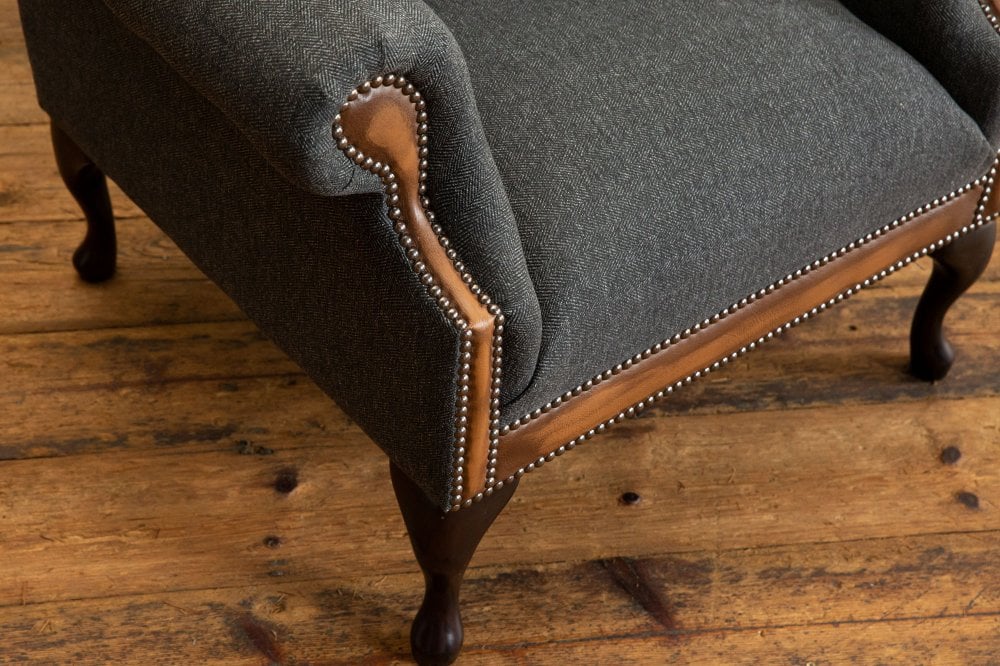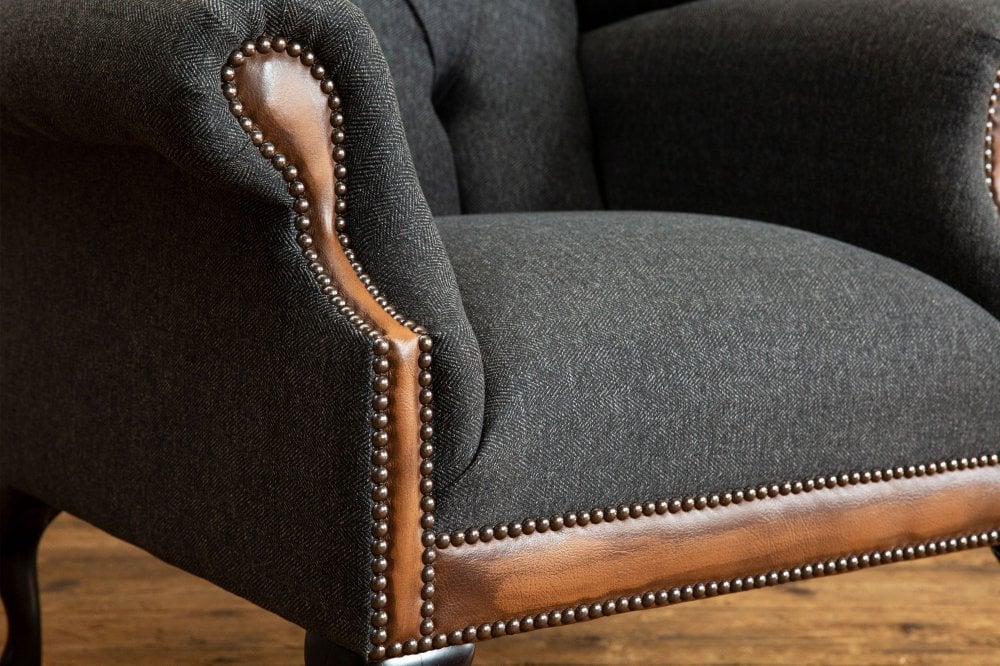 Adding to its unique character, the arm panels and base front are finished in genuine leather, available in your choice of 8 leather colours. Personalise it further with stud detailing in Brass, Chrome, Antique, Copper, or opt for a clean stud-free finish.