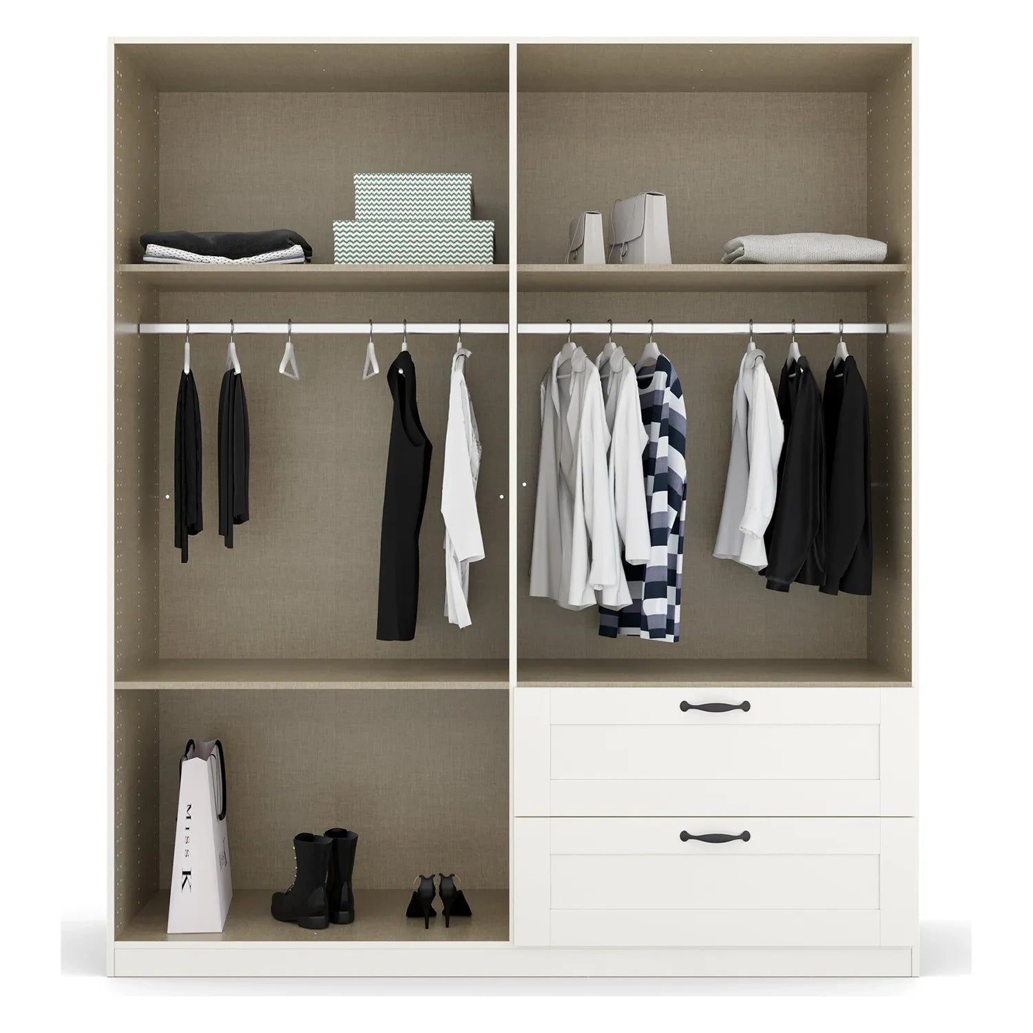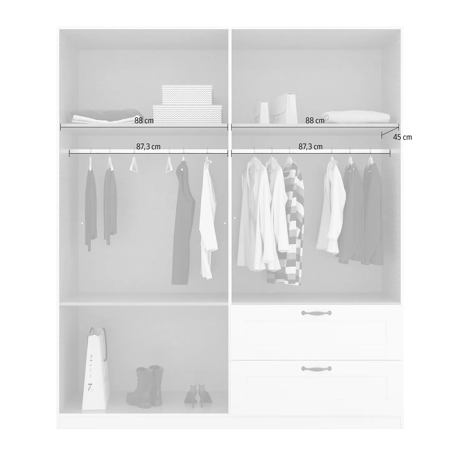 - Spacious drawers integrated beneath the right-hand doors for additional storage