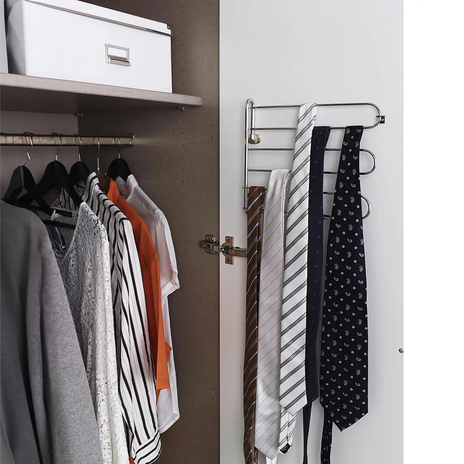 - Swivelling Tie Rack: Conveniently store and access your ties with the built-in swivelling tie rack.